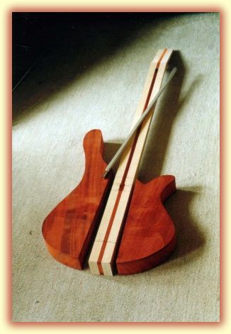 Recently I have been using a different workshop, I used to go to an adult education Wood work course which was held in a local school. They had a band saw, a router and a lot of manual tools. The problem I had there was that I had to share the tools with 8-10 other students and were badly looked after. When the local authority closed down the course I was devastated, I wanted to carry on building basses but had no where to go. So I phoned up Dave Burton, who used to run the course and asked him for suggestions. Dave let me use his workshop for one evening a week, which has proved to be really helpful because I don't have to stop between term-time. Also his workshop is stacked full of really good quality tools, many of which are power tools. Over the last 3 months I have tinkered with several small simple projects, such as recovering my bass cab, fitting the 3 band EQ to the upper horn of my 5 string bass etc, but last night I started the machining of a new bass. I was astounded how much I had got done in one evening! I planed all the neck laminates smooth, cut out the body wings and smoothed the edges to take off the bandsaw marks. In the last workshop this took 4 weeks! Also the quality of my work is far superior. The initial design and paper template didn't take that long to finalise, in fact I spent more time deciding which wood to use! My design brief was simple - a 4 String fretless version of my first bass. It was to be identical except for the wood choice and it was to be fretless. I wanted the same pickup, EQ, knobs etc. I was so surprised at how little time it all took, I had to put the project on hold until the components arrived! |
