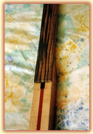 The truss rod is tightened to give the neck a back bow. this will open up the fret slots and make the fitting gf the fret lines easier. All the fret slots are filled with the black veneer and glued into place (except the zero slot which will have standard fret wire). Then the truss rod is slackened off before the glue dries.