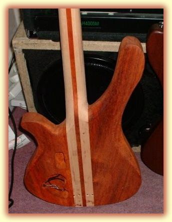 I couldn't resist this photo. Both cousins together. I love the colours on both of these basses, the mahogany is a lot darker than the paduak and the paduak's figuring is more spectacular. Also I like the figured fretless fingerboard. It gives the bass detail which would be lost on the fretted version. This bass is starting to look good! |