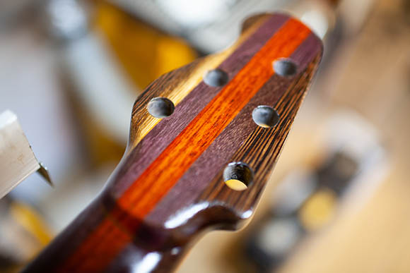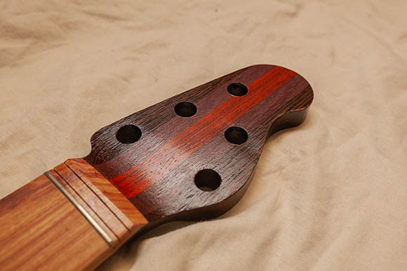 The reduced mass of the headstock looks strangely Fender-esq...and yet it's totally original. Also moving the truss rod adjustment to the other end of the bass allows for a slightly stronger headstock.
